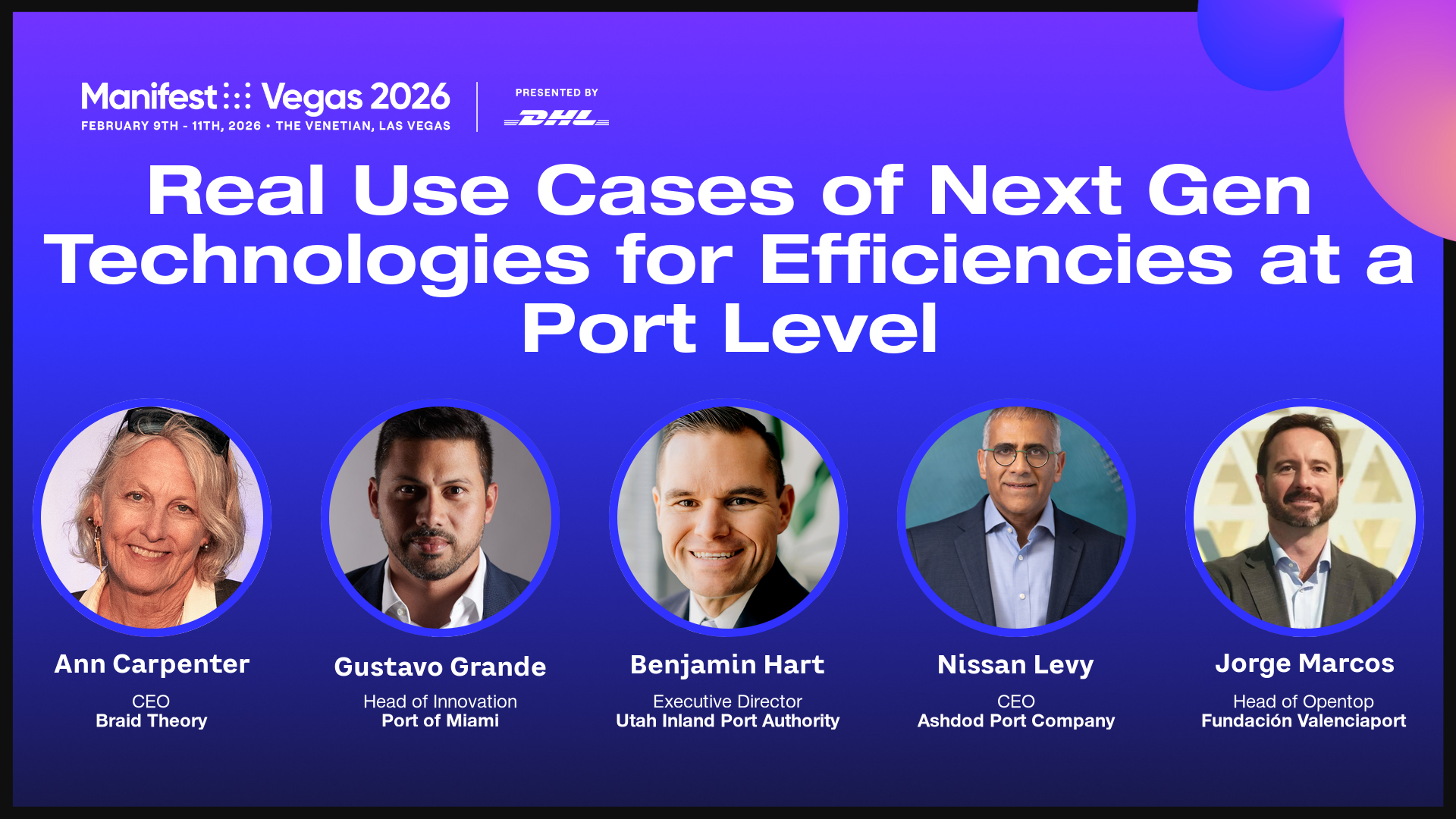 Jorge Marcos participated in the panel "Real Use Cases of Next Gen Technologies for Efficiencies at a Port Level" alongside industry leaders Ann Lee Carpenter (Braid Theory), Gustavo Grande (Port of Miami), Ben Hart (Utah Inland Port Authority), and Nissan Levy (Ashdod Port Company).